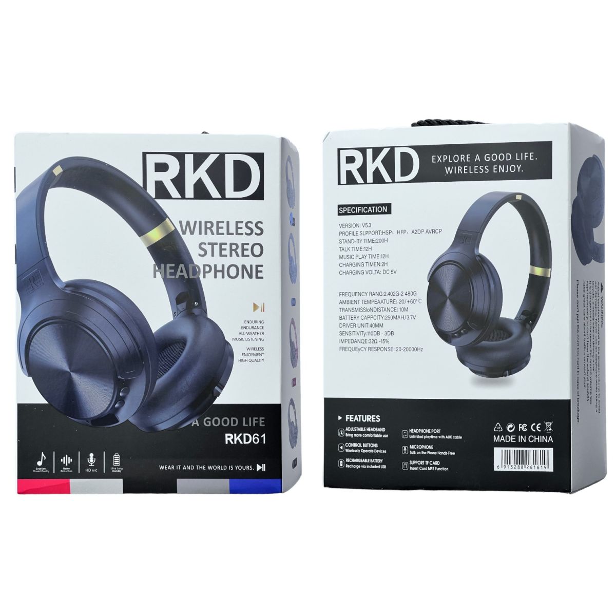 Беспроводные наушники RKD-61 - это удобный гаджет, который Вы сможете комфортно использовать для прослушивания Вашей любимой музыки на телефоне, планшете, ноутбуке, телевизоре. Эргономичная форма обеспечит комфортное использование каждый день. Складная конструкция экономит место при транспортировке. Модель с микрофоном, с отличной передачей звука и по этому вы сможете общается с удовольствием с родными, близкими и по работе. Наушники можно использовать как по блютуз, так и по проводу AUX. Модель имеет вход JACK 3.5.