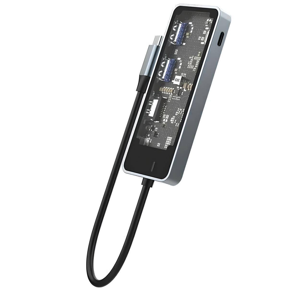 Recci Transparent RH16 HUB 5-in-1 - это возможность быстрой зарядки устройств, поддержка разрешения 4K HD и передача данных со скоростью до 5 ГБ/с. Хаб оснащен 5 портами - USB-C, HDMI и USB 3.0. Переходник поддерживает cквозную быструю зарядку PD 100 Вт. Это означает, что вы можете при работе на ноутбуке, одновременно заряжаться через HUB ваш компьютер и заряжаться слабыми токами от USB порта. С помощью адаптера можно подключить ноутбук к проектору, телевизору. Он работает с разными версиями Windows, Mac OS, Linux и Chrome OS, а также поддерживает планшеты и смартфоны - Apple, Samsung, Huawei, Xiaomi. Он изготовлен из алюминиевого сплава и прозрачного акрила - устойчив к износу, выцветанию, повреждениям и высоким температурам.