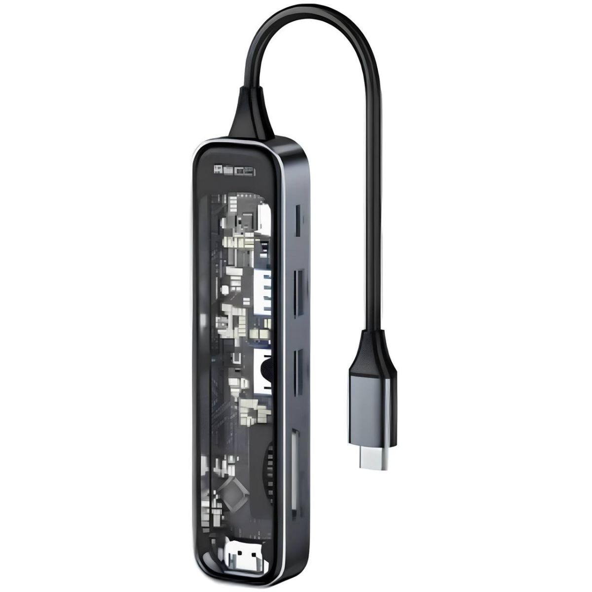 6в1 RECCI RH21 USB-C MULTIMEDIA ADAPTER (HDMI+2USB3.0+USB-C+PD100W+SD) TRANSPARENT METALGREY