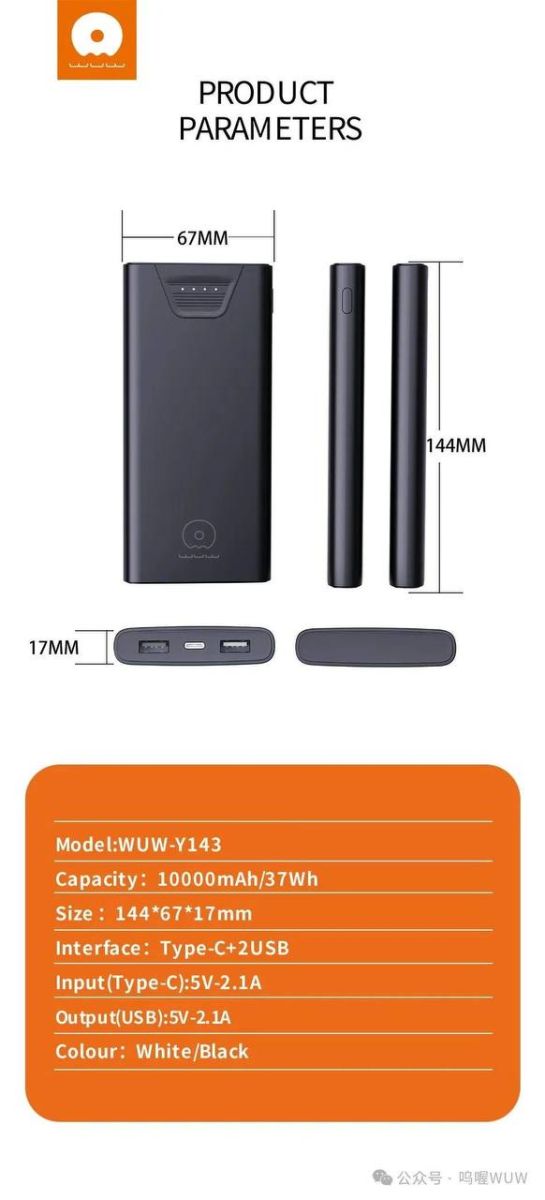 Внешний аккумулятор WUW Y143 Power 10000 mAh представлен в компактном размере 6,7х14,7х1,6 см. Мощность составляет 10 Вт.