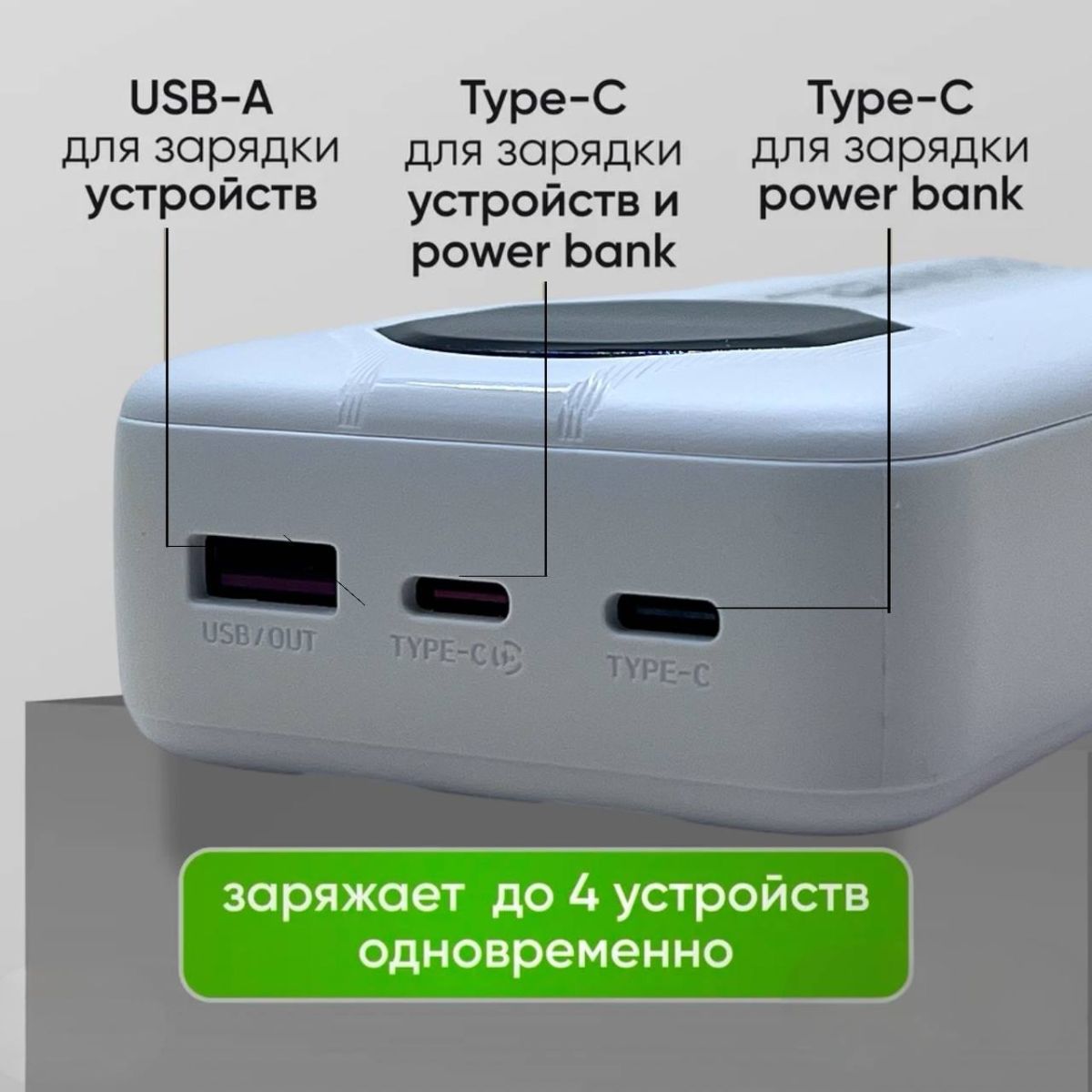 Повербанк на 20000 мАч с индикатором уровня заряда и двумя встроенными проводами — это идеальное решение для зарядки ваших устройств в любом месте. Оснащённый двумя портами и встроенными кабелями, он позволяет удобно заряжать одновременно несколько гаджетов. Порт Type-C используется как для подзарядки айфонов с разъемом Type-C - Lightning, так и для самого power bank. Устройство предлагает один способ зарядки: через порт Type-C. Благодаря технологии быстрой зарядки, ваш гаджет сможет получить питание всего за 50 минут. Уникальная возможность параллельной зарядки позволяет одновременно зарядить как телефон, так и сам повербанк. Он прекрасно подходит для телефонов, планшетов и наушников, но не предназначен для ноутбуков и высокомощных устройств.