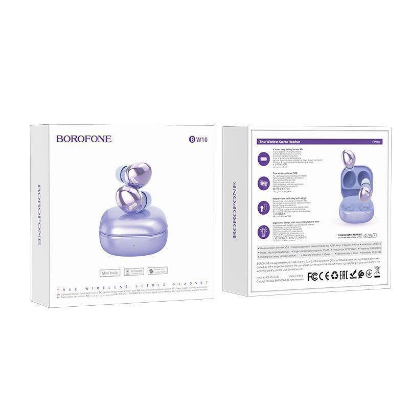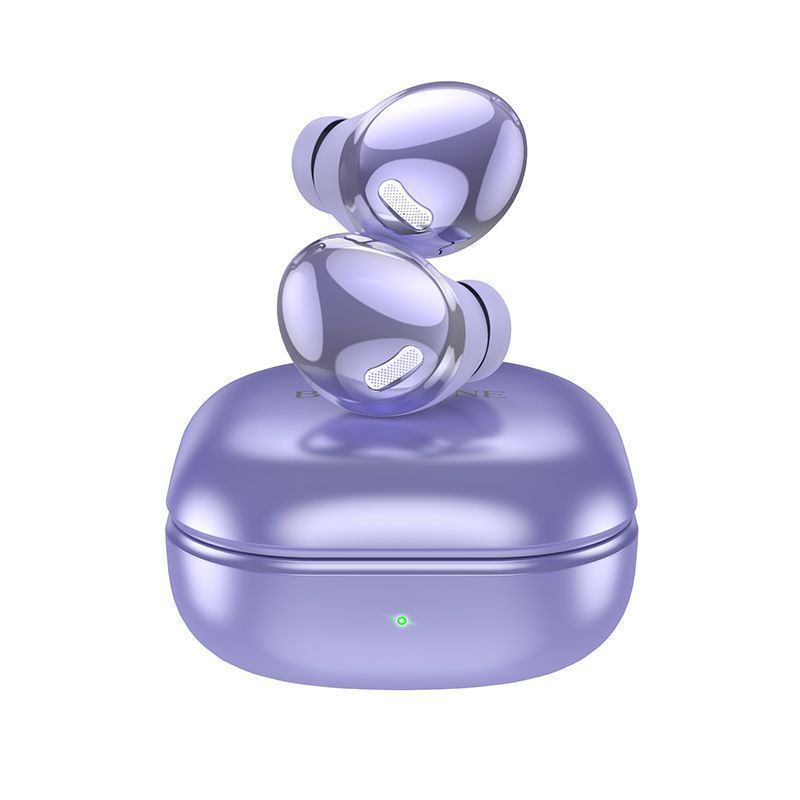 Bluetooth гарнитура BOROFONE BW-10 Purple выполнена в классическом стиле AirPods, с анотомической формой, что позволяет не выподать и не доставлять дискомфорт во время долгого использования.