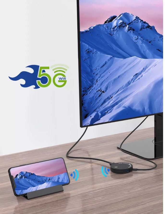 Поддерживает беспроводное соединение или подключается напрямую через высокоскоростной порт USB 3.0. Функция беспроводной связи позволяет подключить ваш мобильный телефон к экрану телевизора или проектору, поддерживающему порт HDMI, на расстоянии до 10 м с четким разрешением HD1080P.
