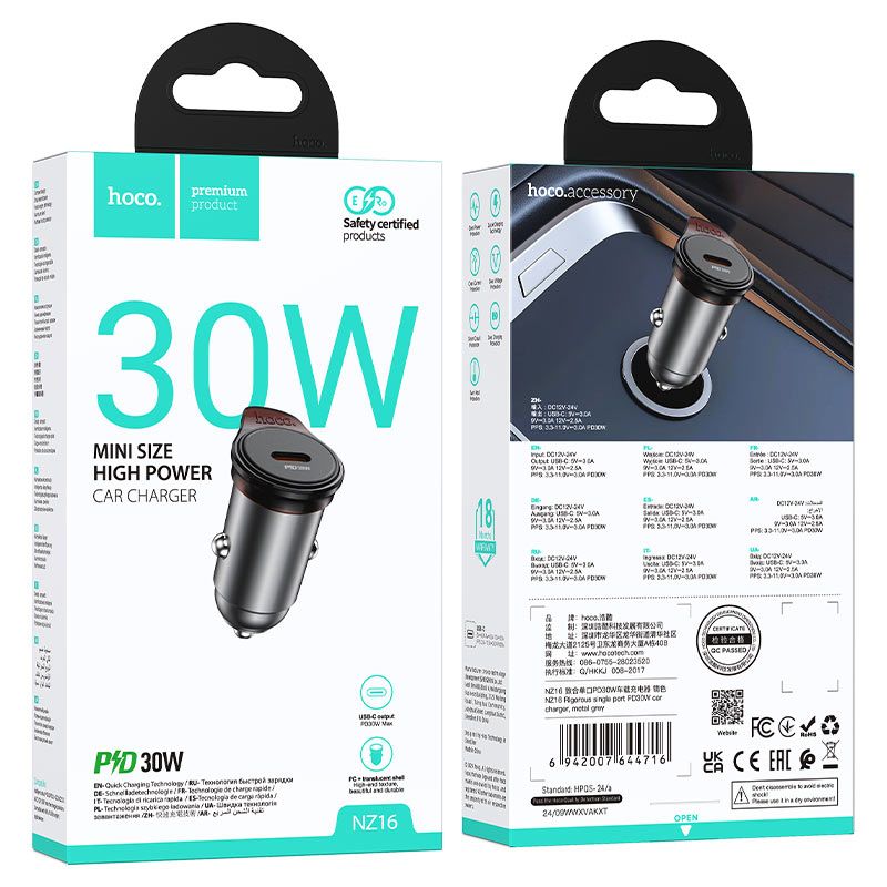 NZ16 Rigorous, автомобильное зарядное устройство с одним Type-C 30W выходом, поддержка протоколов быстрой зарядки