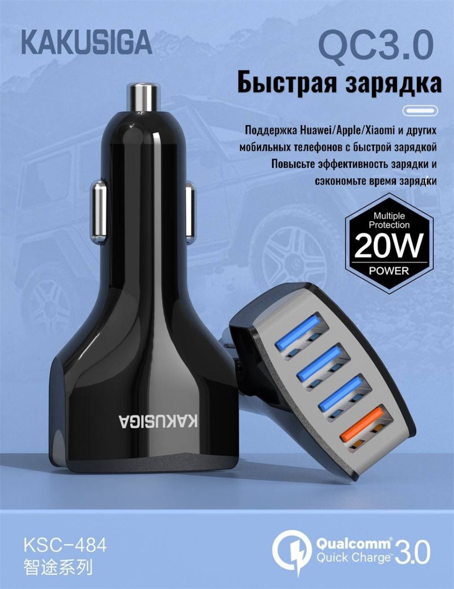 Автомобильное зарядное устройство KAKU KSC-484. Максимальная выходная мощность составляет 4,8А. Данное АЗУ обладает защитой от перенапряжения и перегрузки электричества. Это защитит устройство, которое находится на зарядке, от поломки. Сам корпус сделан из огнестойкого прочного пластика. Имеет 4 выхода USB. Блок без кабеля.
