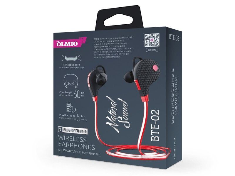 Беспр. наушники OLMIO BTE-02 BT4.0 - Спортивные наушники BTE-02 помогут зарядиться энергией и обеспечат необходимый настрой для занятий физической активностью. Модель особенно подойдет любителям бега: стереогарнитура удобно сидит в ушах, не натирает и не спадает, а кабель, соединяющий наушники, покрыт светоотражающим веществом, поэтому бегуна легко заменить в темноте.