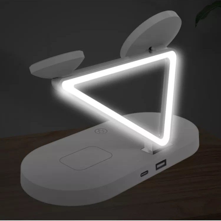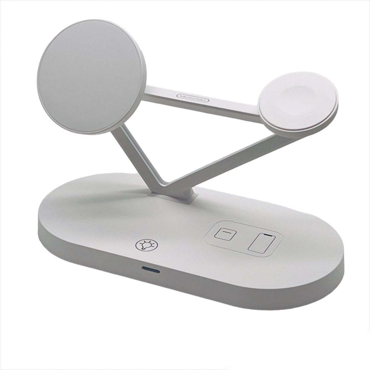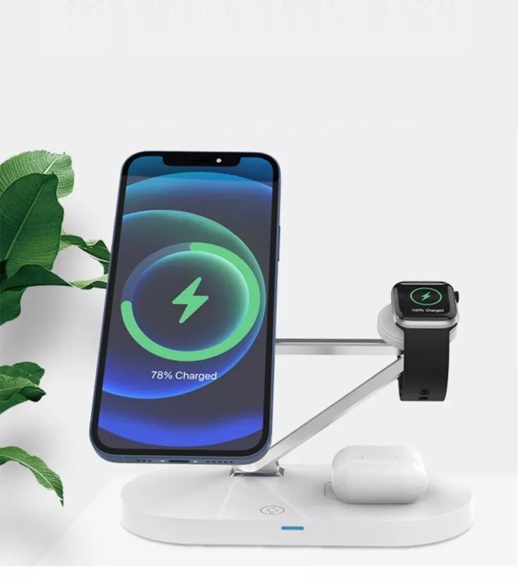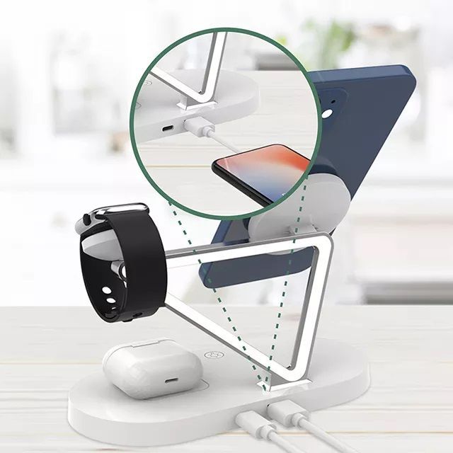Беспроводная станция 5 в 1 WUW Z9 15W в белом цвете - создана для зарядки устройств Apple: iPhone с функцией беспроводной зарядки, AirPods 2/Pro и Apple Watch – и других смартфонов или наушников TWS. От такой беспроводной станции можно заряжать до четырех устройств одновременно. Устройства на MagSafe 15W удерживаются с помощью мощного магнитного модуля, предотвращающего падение. Конструкция беспроводной станции сделана из прочного и высококачественного металлического сплава. Также очень интересен дизайн – с задней стороны прибора расположена светодиодная подсветка, которая придает устройству эстетичный и аккуратный внешний вид. Мощность станции 15 Вт, что дает возможность подзарядить гаджет достаточно быстро. Компактное устройство для подзарядки гаджетов выглядит в стиле минимализма, красиво и без проблем впишется в любой интерьер будь то офис или квартира, где точно пригодится и будет работать долгое время. Зарядка трёх устройств от беспроводной станции плюс зарядка одного устройства от кабеля и светильник на задней панели зарядной станции.
