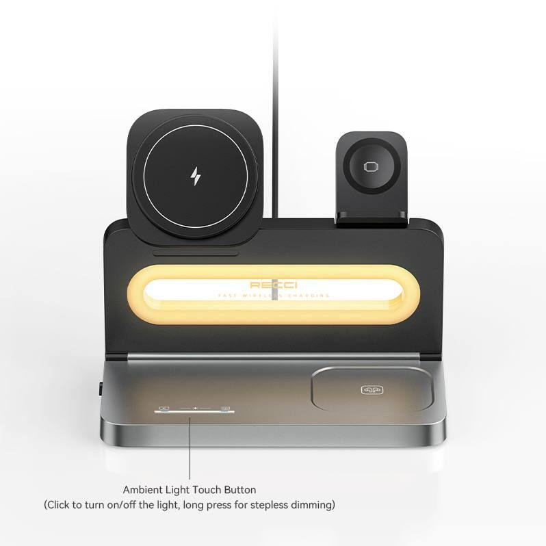 Recci 4-in-1 - это беспроводная зарядная док станция для зарядки 3-х гаджетов одновременно. Девайс способен заряжать беспроводным способом одновременно любой смартфон с поддержкой Qi, смарт часы и наушники c поддержкой беспроводной зарядки. В комплекте имеется кабель для подключения данного девайса к адаптеру питания (адаптер в комплект не входит). Стильный современный дизайн прекрасно впишется в любой интерьер, а LED подсветка с сенсороной регулировкой яркости будет полезна в ночное время в качестве ночника.