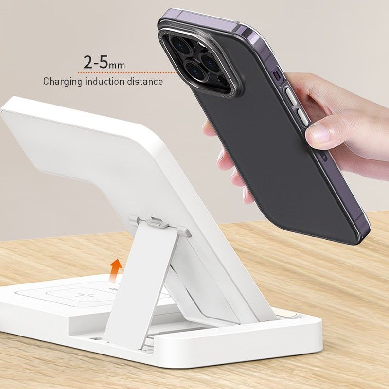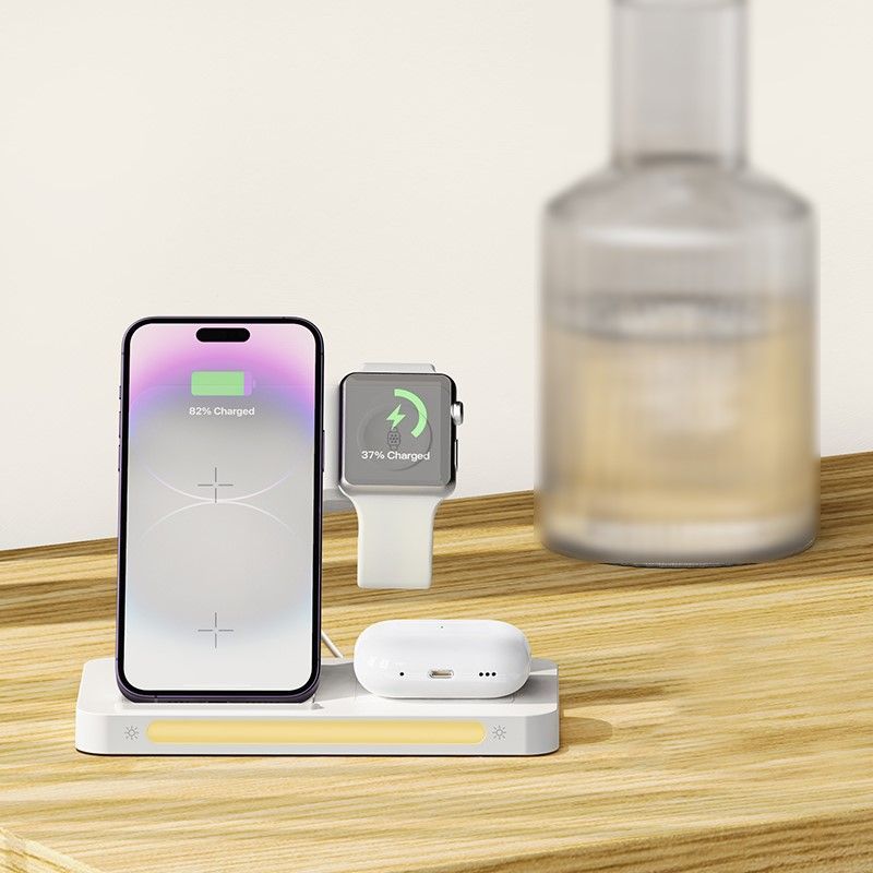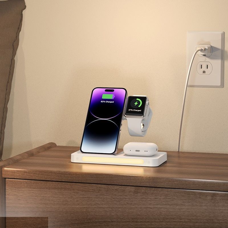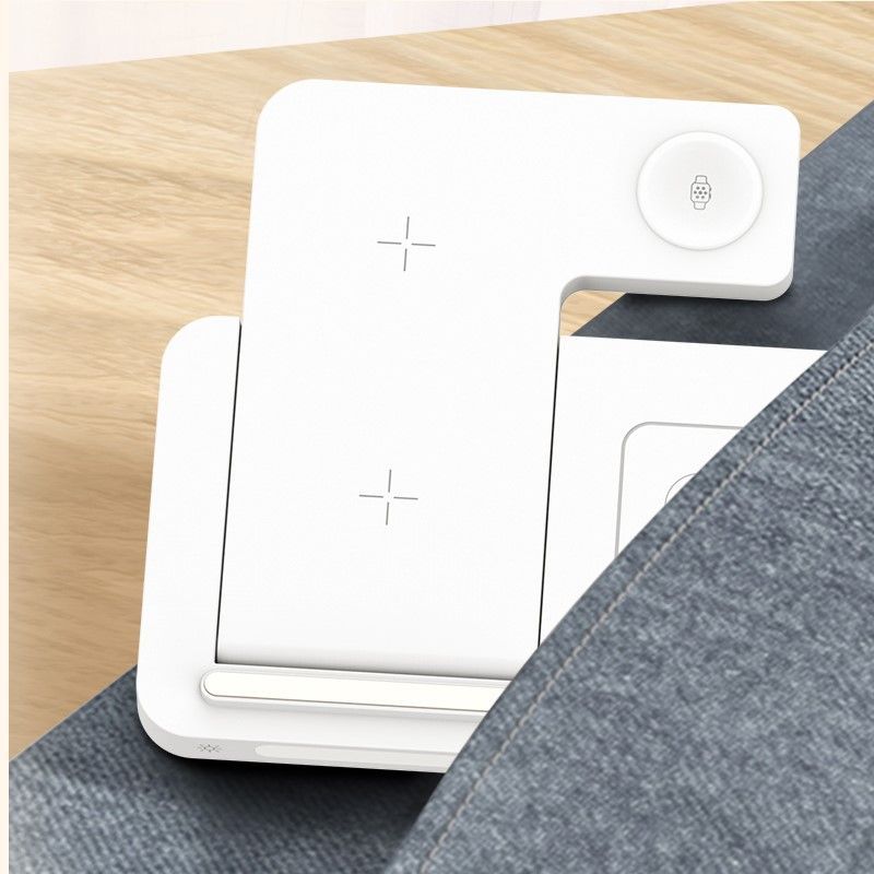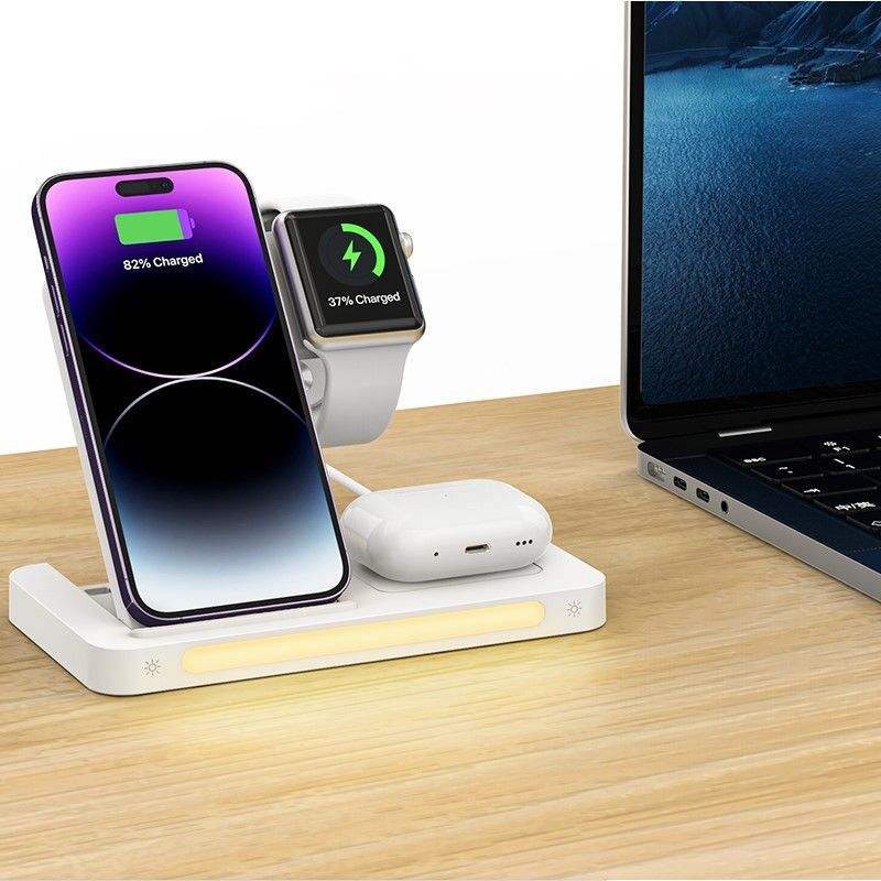Беспроводное зарядное устройство ночник 4 в 1, как универсальное устройство позволяет одновременно заряжать мобильный телефон, смарт-часов, беспроводных наушников и других устройств. Интеллектуальная индукция. Сглаживающий складной кронштейн для мобильного телефона предохраняет устройства от перегрева, короткого замыкания и перегрузок. Трех уровневое освещение легко адаптируется к свету в комнате. Складная конструкция портативного устройства позволяет носить с собой в путешествие за счет легкости и компактности.