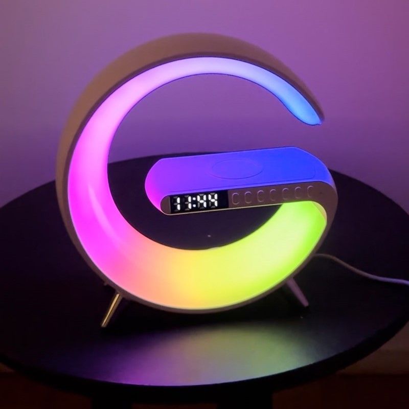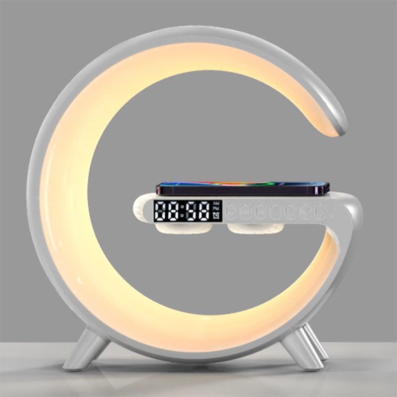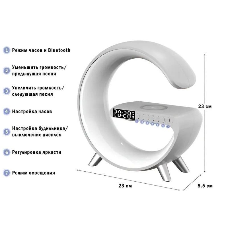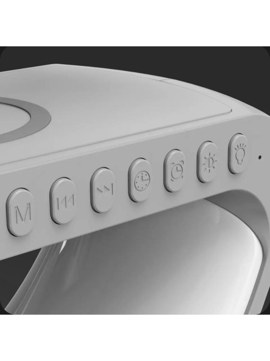 Многофункциональная беспроводная лампа совмещает в себе функции зарядного устройства (для телефона, наушников, смарт часов), bluetooth-колонку, ночник, часы и будильник.