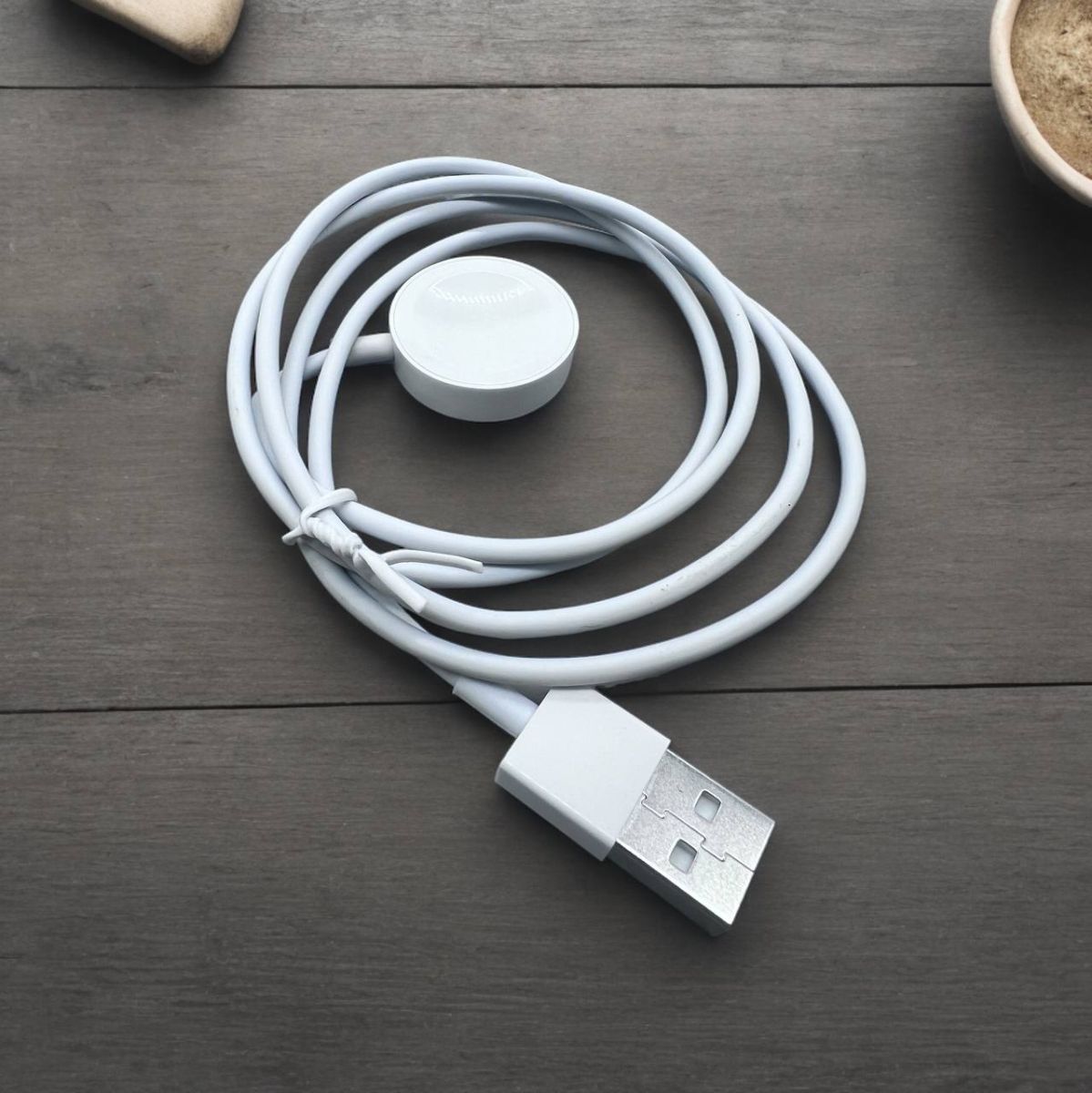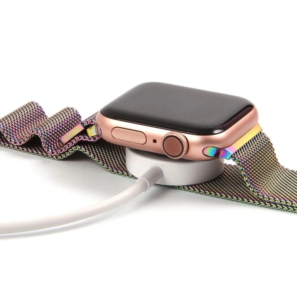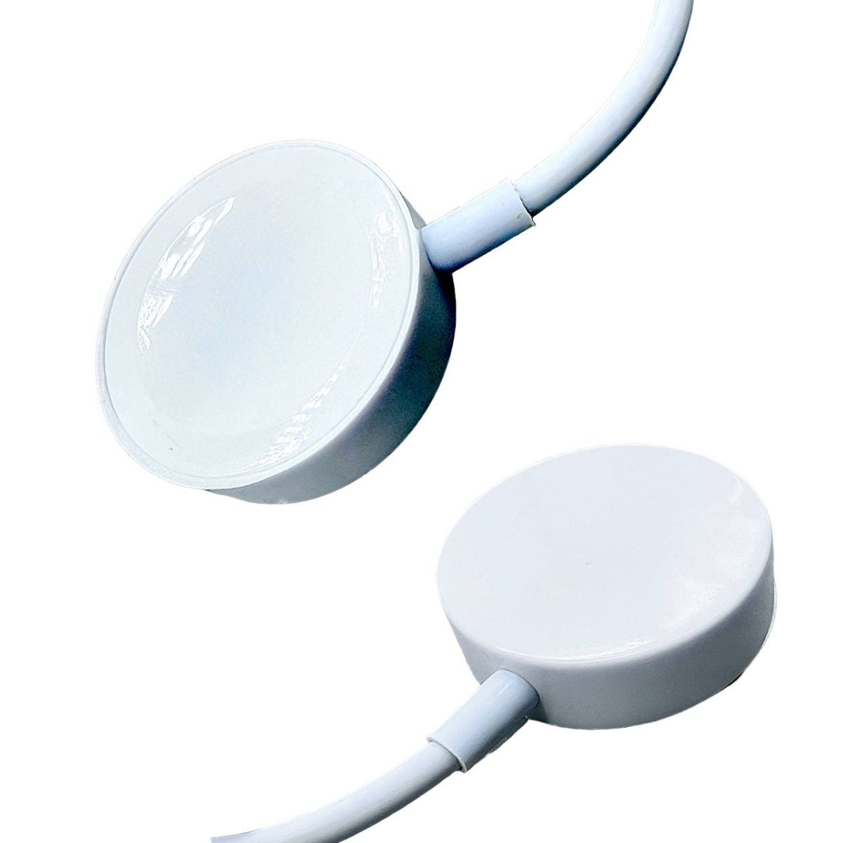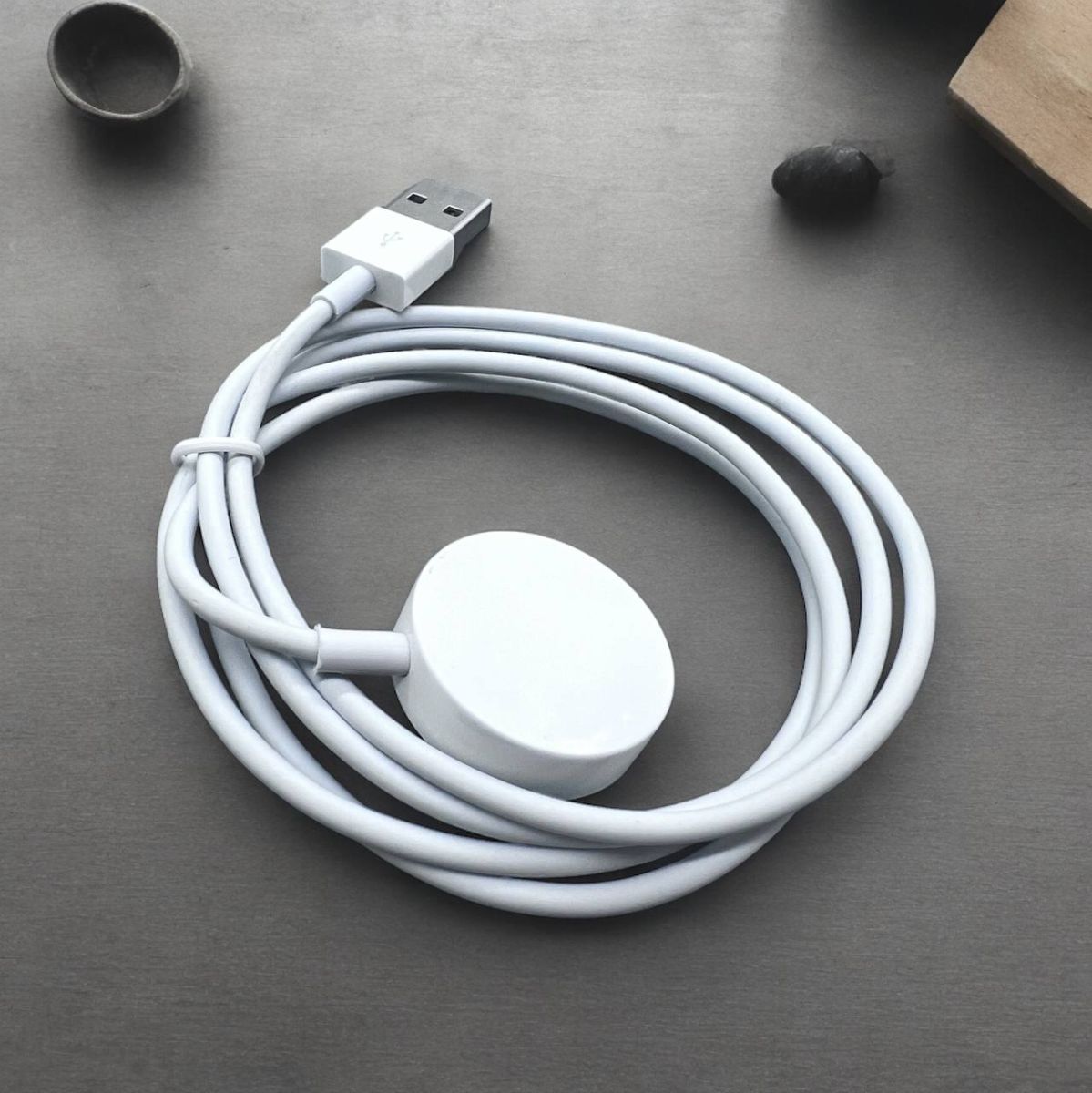 Зарядное устройство для всех поколений Apple Watch. Подключается к сетевому адаптеру с USB разъемом, USB разъему ноутбука или power bank. Длина - 1м. Работает по технологии индуктивного заряда. Это полностью закрытая система без внешних контактов. Она очень неприхотлива и не требует точной настройки. Нужно лишь поднести круглое основание зарядки к задней поверхности часов и благодаря магнитам оно автоматически зафиксируется в нужном положении. Кабель подходит для Apple Watch 1,2,3,4,5,6,SE серий любых размеров.