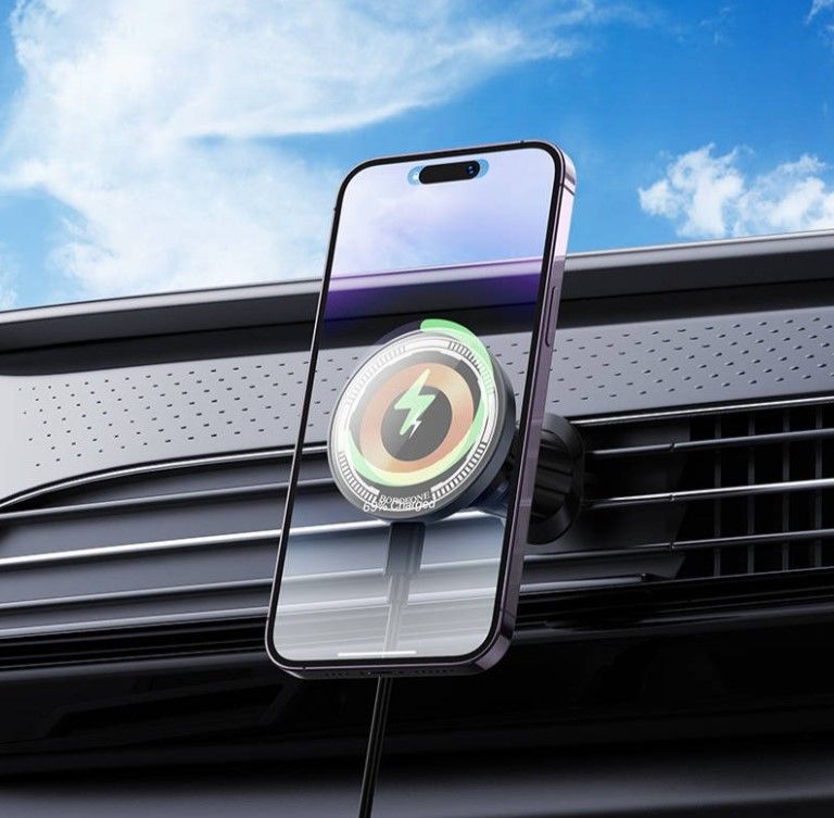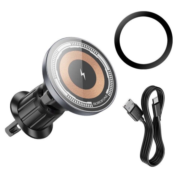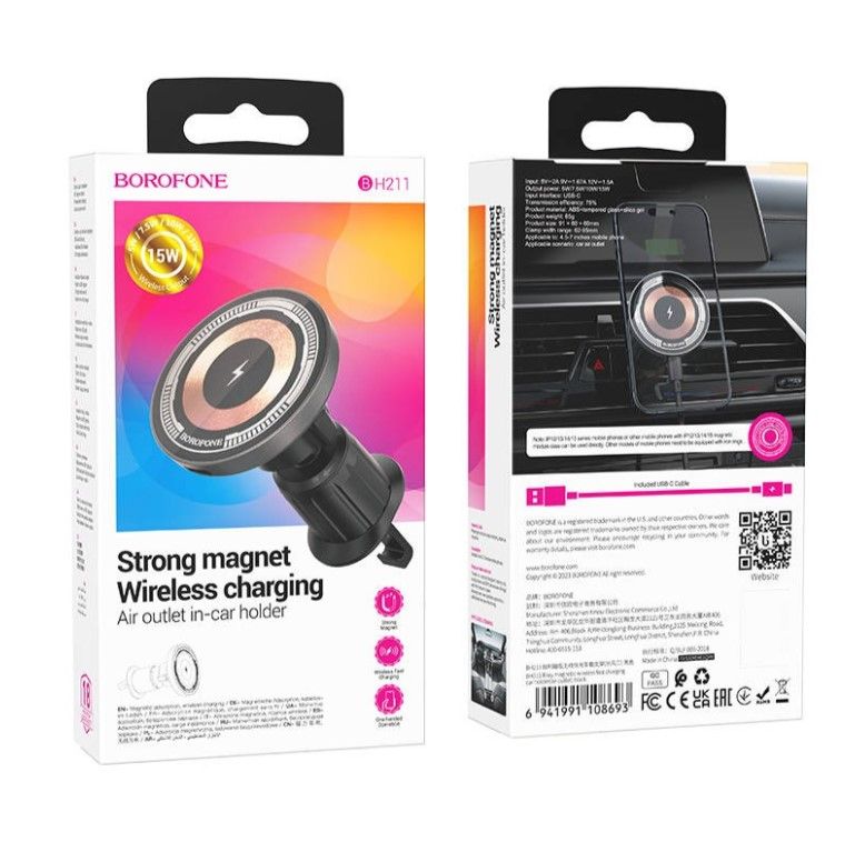 BOROFONE BH211 - это автомобильный держатель телефона с беспроводной зарядкой MagSafe и магнитным креплением. Мощность беспроводной зарядки составляет до 15 Вт (MgS - 7,5 Вт). Для корректной работы зарядки необходимо автомобильное зарядное устройство поддерживающее протоколы быстрой зарядки. Место крепления держателя - воздуховод