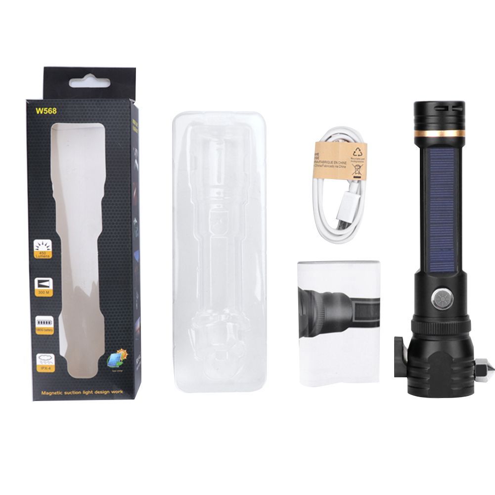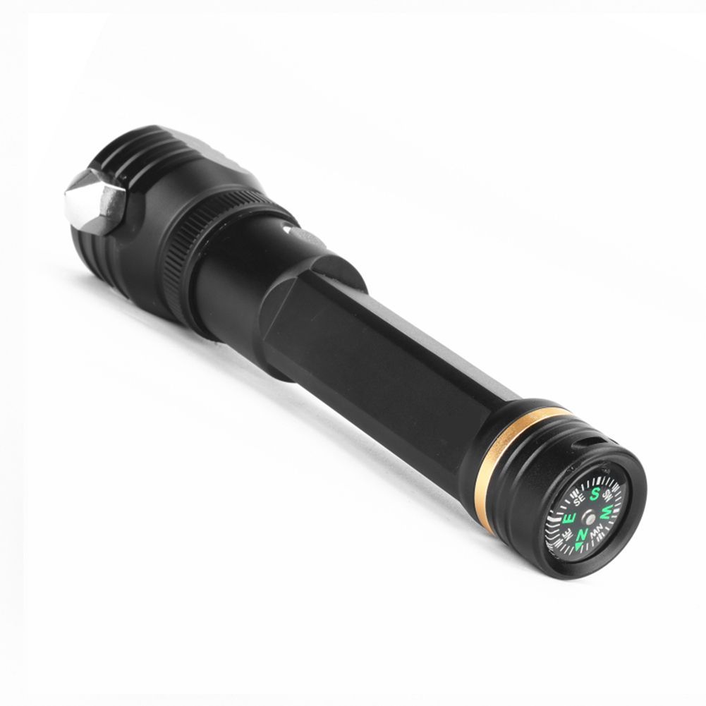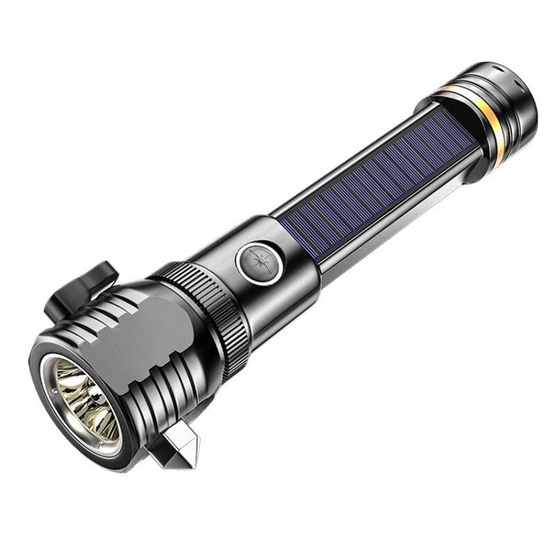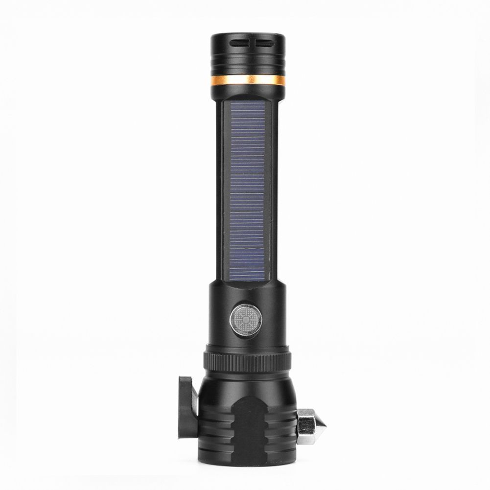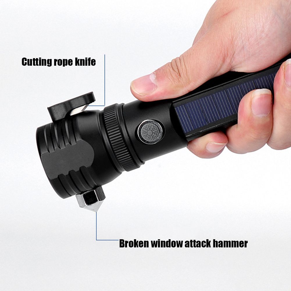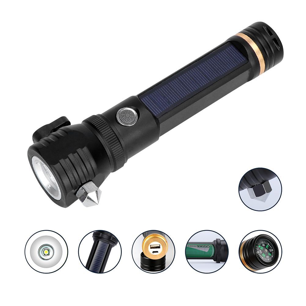 Аккумуляторный светодиоидный фонарик, на солнечной батарее, с аварийным молотком и лезвием, а также компасом для кемпинга, спорта и отдыха.