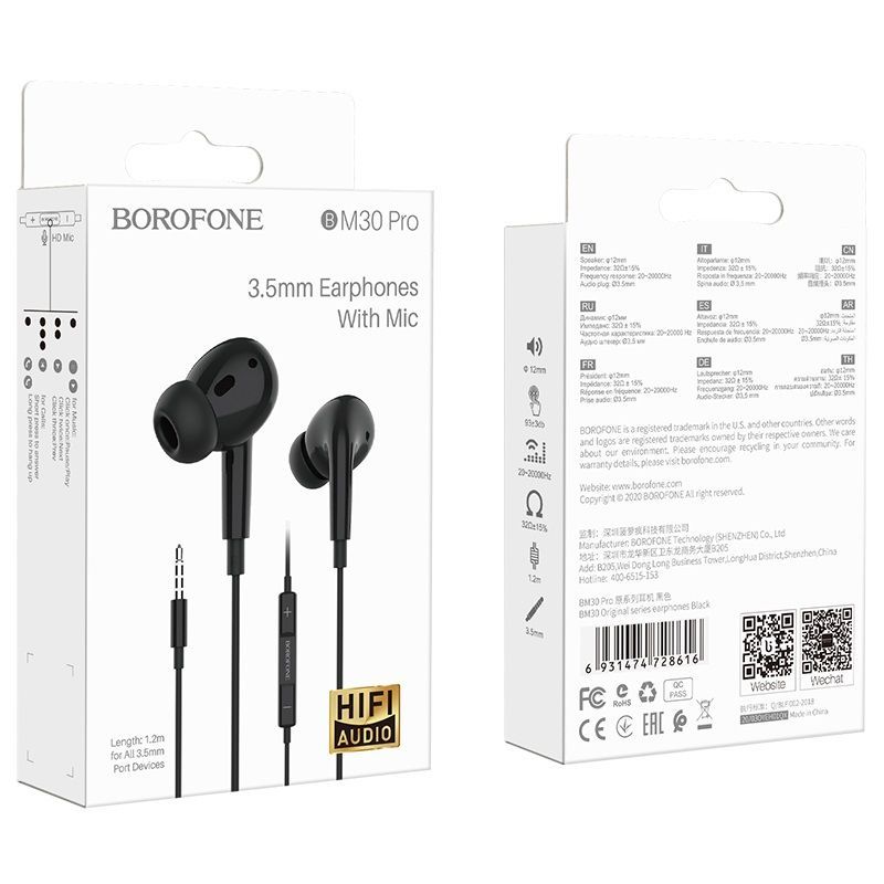 - Наушники BM30 PRO от производителя Borofone сделаны специально для пользователей Apple. Наушники почти в точности повторяют структуру оригинальных Earpods, надежно фиксируются в ушных раковинах и обладают прекрасным звучанием. Аудиовыход - 3.5 мм как и в оригинальных наушниках, встроенный микрофон и контролер звука / переключения треков.