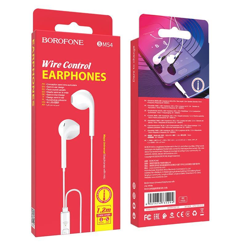 BOROFONE BM54 - отличная гарнитура в стильном дизайне. Благодаря наличию технологии подавления эха и шумов даже в шумной обстановке будет обеспечена замечательная слышимость. Качественные комплектующие позволяют добиться высокого качества звучания даже при длительном проигрывании музыки. Микрофон обладает высокой чувствительностью и может уловить даже шёпот. Мягкие эргономичные силиконовые амбушюры плотно приникают к поверхности уха. Получайте удовольствие от звучания без посторонних звуков. Кнопки управления удобно расположены на кабеле, вам не придется доставать ваш гаджет из сумочки или кармана.