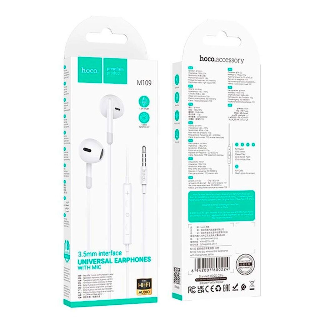 Гарнитура HOCO M109 (White) - Проводные наушники с отличным качеством звучания, а также превосходным сочетанием цена-качество. Эргономичная форма наушников надежно "ложится" в ушную раковину, благодаря специально разработанной форме, позволяя использовать наушники даже во время домашних дел или активных занятий спортом. В 27 сантиметрах от вкладышей располагается пульт с микрофоном, который позволит Вам не только слушать музыку, но и общаться по телефону. Там же расположена кнопка ответа/завершения входящего вызова, благодаря которой нет необходимости доставать телефон при входящем звонке. Кабель тонкий, круглый, мягкий, при этом прочный и устойчивый к спутыванию, покрыт силиконовой оболочкой. Хактеристики: Частотный диапазон, Hz: 20-20 000