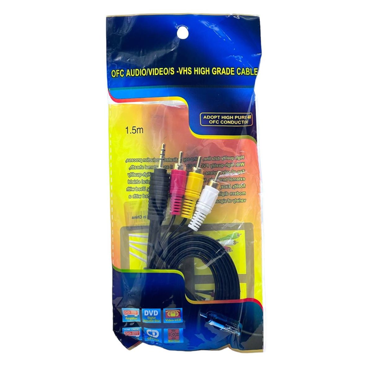 Аудио-Видео кабель 3,5 jack (TRRS, штекер) - 3RCA (колокольчики) в организации передачи высокоскоростного звукового и видео сигнала.Кабель предназначен для соединения элементов различных аудио-видео систем, в основном используется для систем спутникового телевидения а также различных смарт приставок и систем кабельного телевидения. Кабель позволит вам легко и быстро выполнить необходимое подключение, получив при этом прекрасное качество изображения и звучания.Колпачки штекеров окрашены в яркие цвета для удобства использования.Материал проводника медь.Штекеры выполнены из легкого и прочного пластика.Контакты разъёмов никелированные.