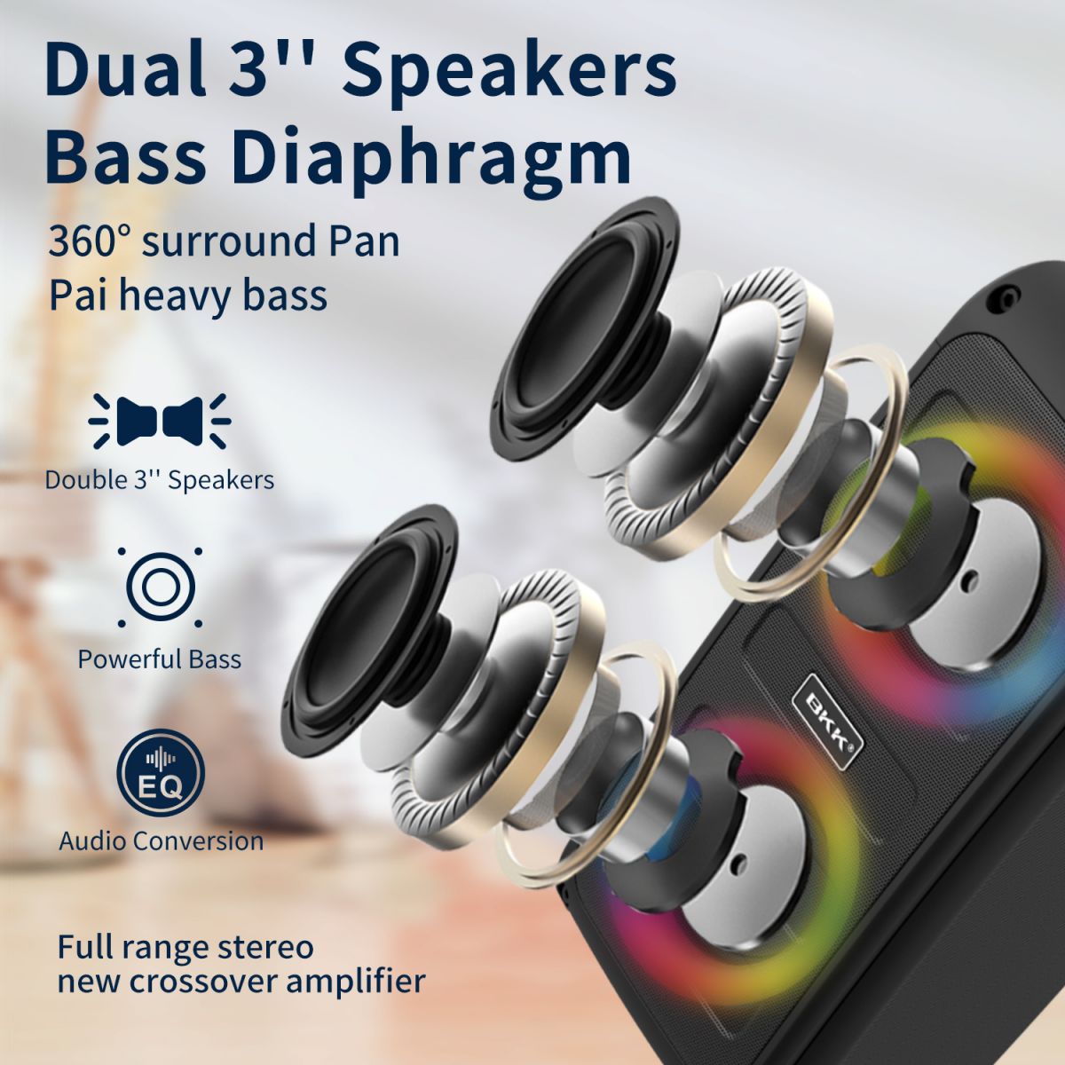 Система BKK B87 имеет мощный звук 2*10w и яркую динамическую подсветку, наполняющую окружающую атмосферу музыкальными ритмами и зажигательным настроением.