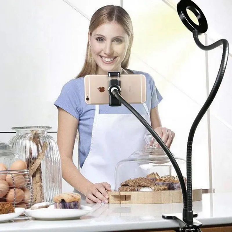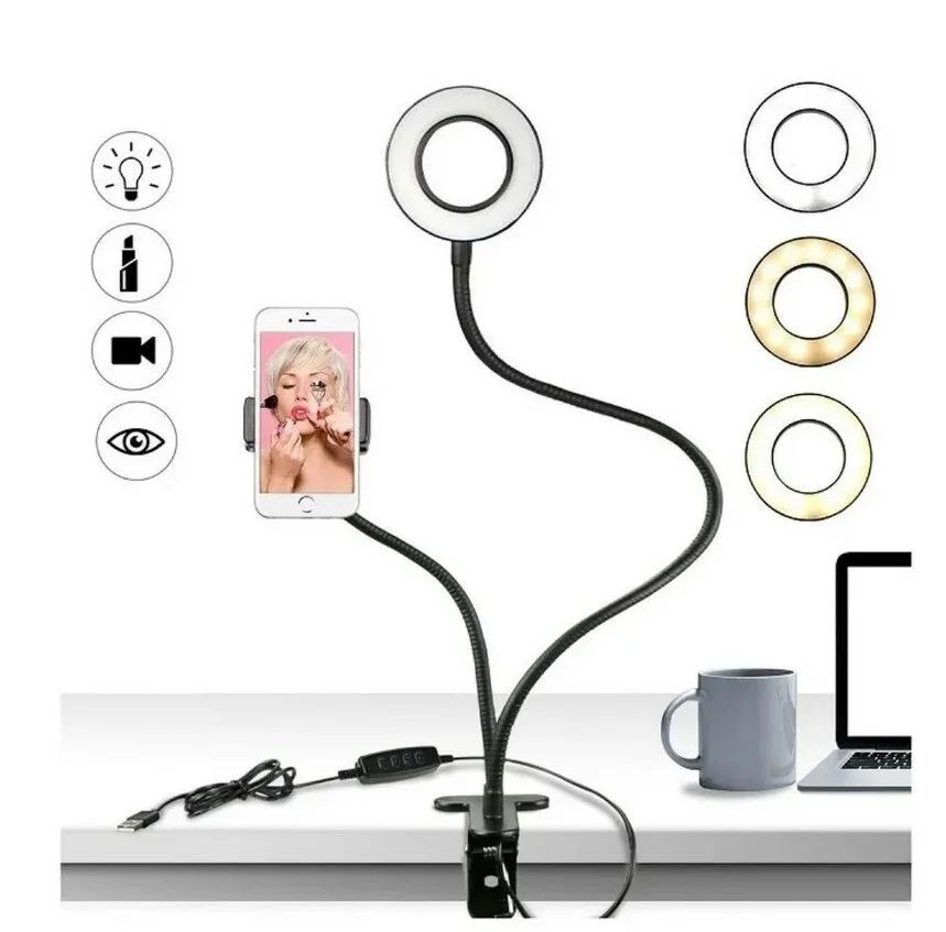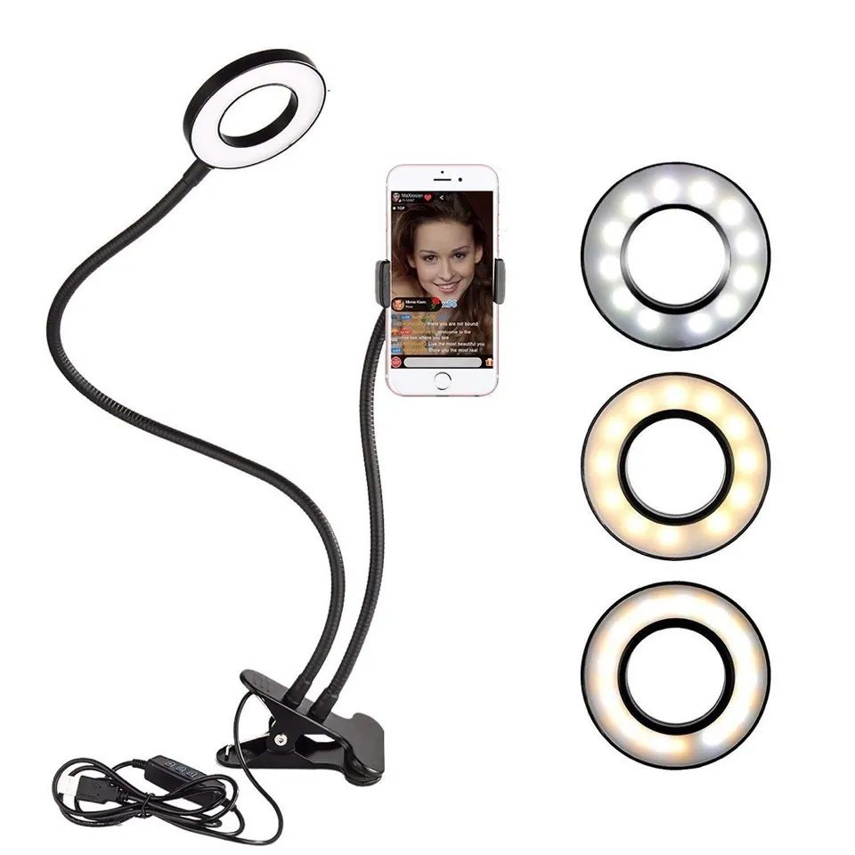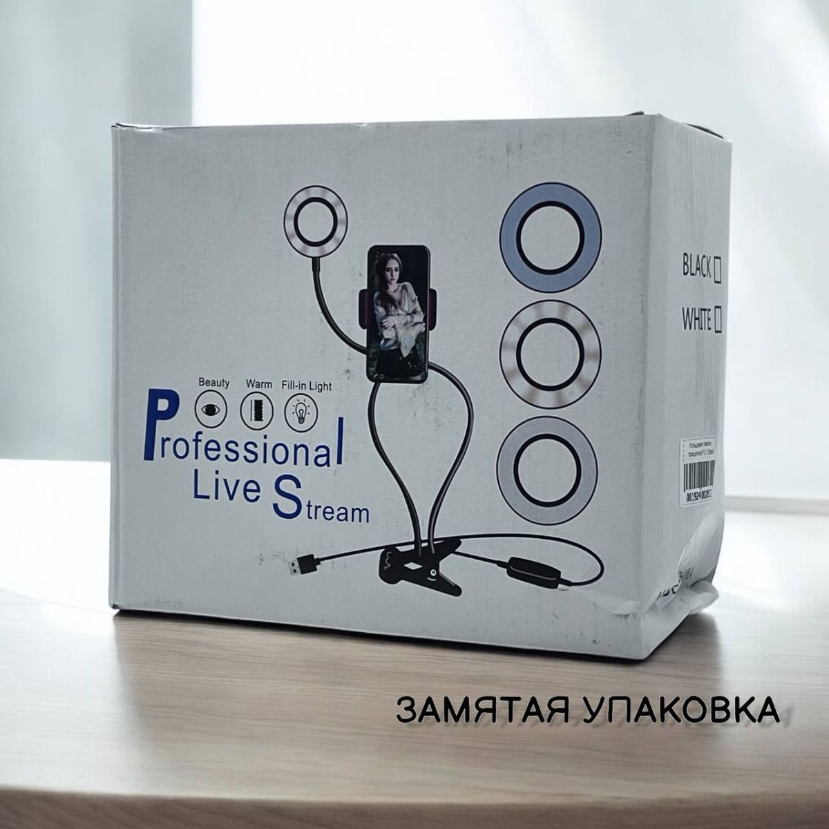 Светодиодная кольцевая лампа Professional Live Stream для фото и видео съемки с держателем для смартфона - это доступное каждому профессиональное освещение для фото и видео съемки, живых трансляций в социальных сетях, детальной съемки, дополнительного освещения. Live Stream имеет новый дизайн, сочетающий в себе держатель для телефона и кольцо для селфи установленные на гибких регулируемых кронштейнах с креплением к столешнице на прищепке. Лампа имеет 10 уровней настройки яркости, а температура её освещения имеет 3 режима: белый, теплый желтый, теплый желтый + белый. Держатель телефона с подсветкой Selfie Ring Light - идеальный дополнительный свет для макияжа, селфи, видеозвонков и лайв трансляции на YouTube, Vkontakte, Facebook, Insagram, Periscope, live musical, twitter и т.д.