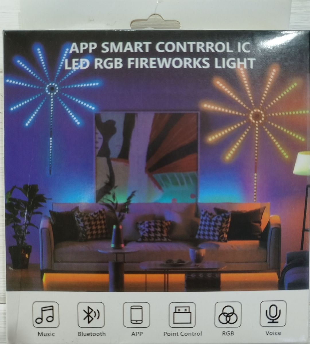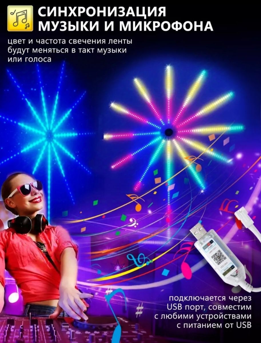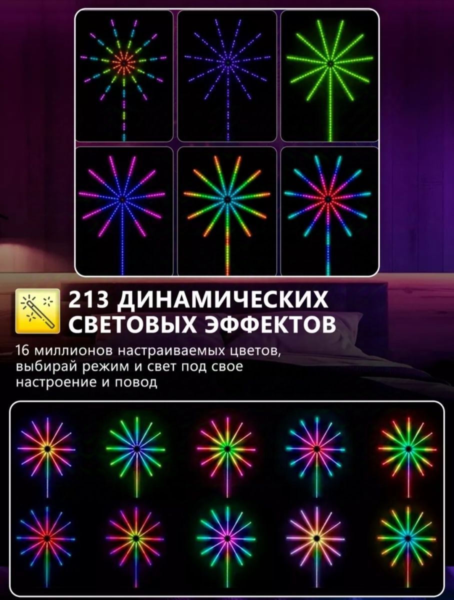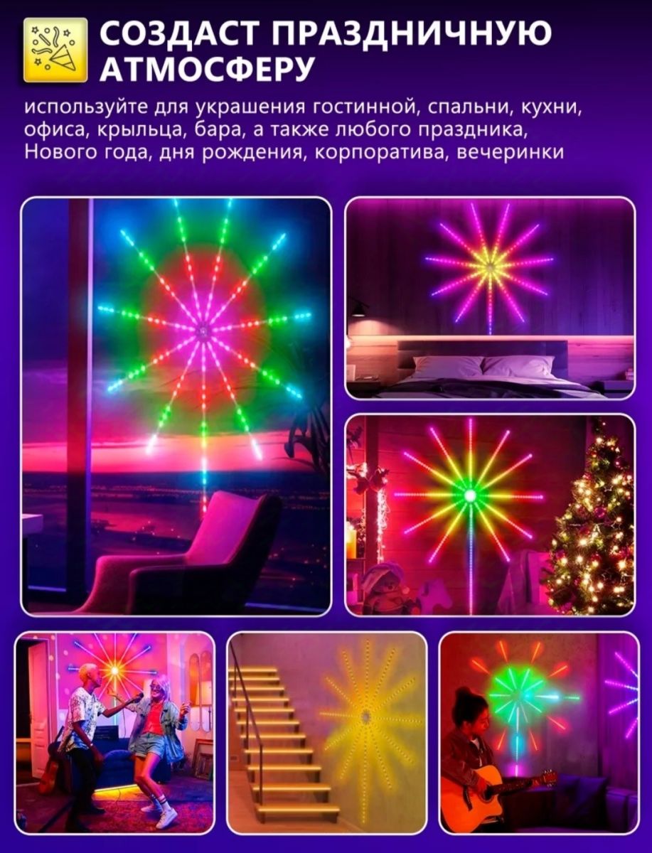 Умная SMART гирлянда RGB фейерверк.Огромное количество режимов и цветов,удобное управление с помощью пульта или приложения на телефоне через блютуз, USB подключение, адоптация под музыку или голос.