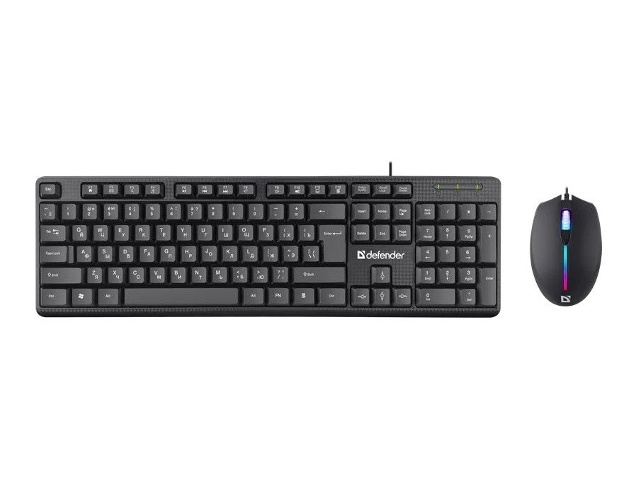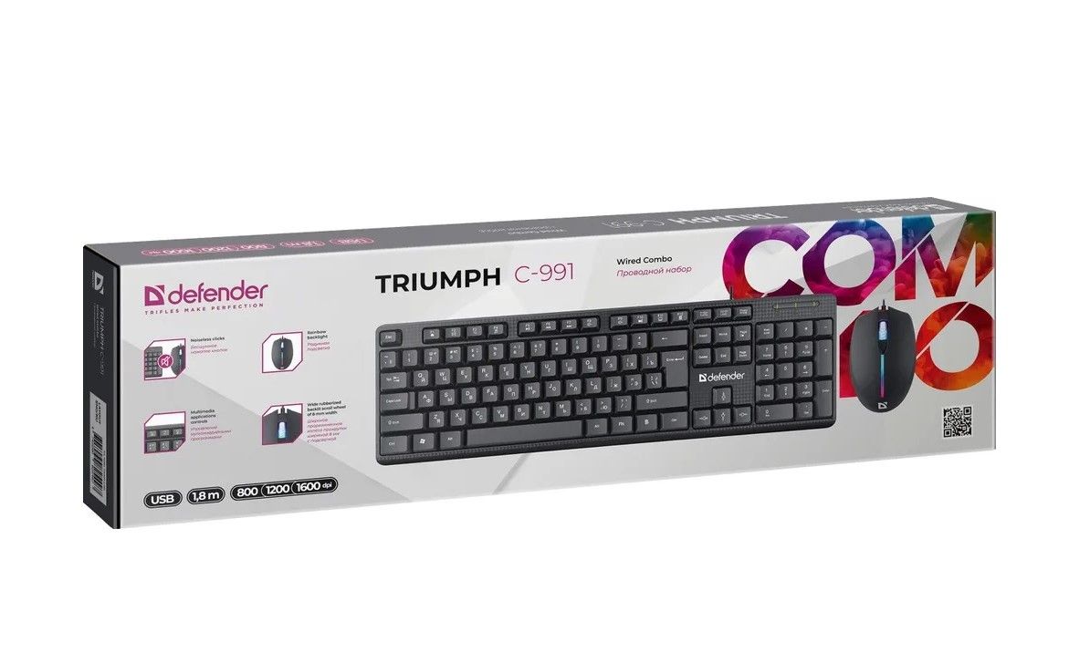 Удобный проводной офисный набор. Бесшумные клавиши клавиатуры и кнопки мыши - главное достоинство этого набора. У клавиатуры классическая раскладка с увеличенными клавишами Ctrl, Shift, Enter и BackSpace. Мышка имеет радужную подсветку, 3 режима разрешения и симметричный корпус, удобный для работы любой рукой.