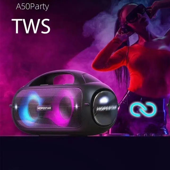 Новая модель A50 Party - модель с динамиками большой мощности, которые позволяют получать чистое звучание с глубокими басами. Бумбокс обладает великолепным, мощным и насыщенным звуком выдавая суммарно 80 Вт, модель имеет красивую подсветку, что может не радовать.