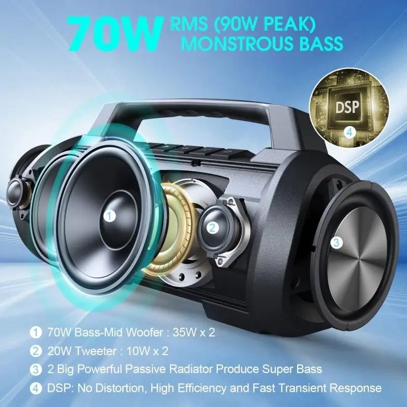 Данное устройство будет работать надежно в любых условиях. Отлично подойдет для отдыха на природе, домашней дискотеки или пати на пляже. Качественные аккумуляторы позволяют использовать устройство до 7.5 часов. ( в зависимости от громкости)