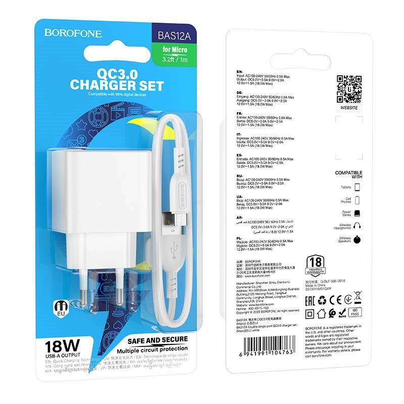 Читать все статьиСЗУ BOROFONE BAS12A 1*USB-A+MICRO QC3.0 18W White