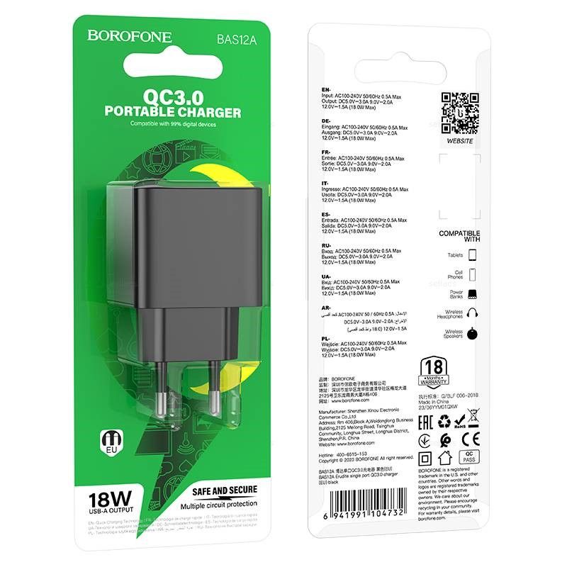Читать все статьиСЗУ BOROFONE BAS12A 1*USB-A QC3.0 18W Black