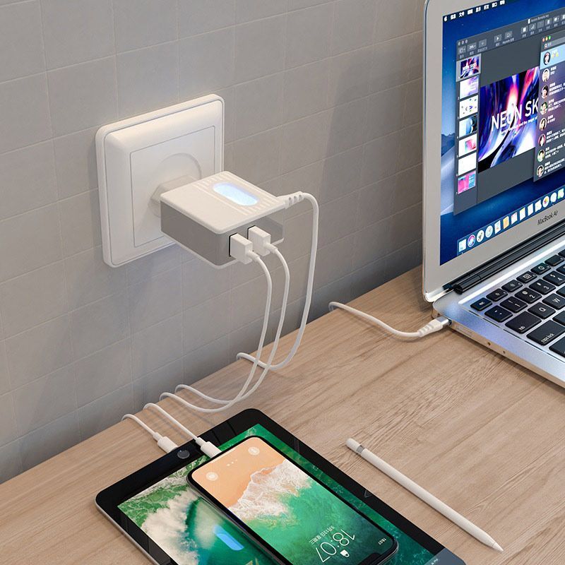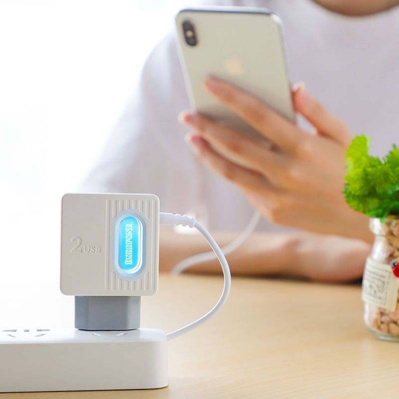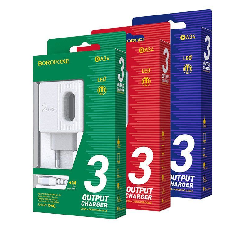 Сетевое зарядное устройство Borofone BA34 может заряжать три смартфона одновременно. Для этого у него имеется два USB-порта и несъемный кабель со штекером Lightning Выходной силы тока 2.4 А достаточно, чтобы заряжать не только телефон, но и планшет. Если задействованы оба разъема, то максимальная сила тока будет делиться пропорционально и составит 2.4 А. Встроенная многоуровневая система защит от скачков напряжения и короткого замыкания делает использование зарядки абсолютно безопасным, а также исключает вероятность перезаряда заряжаемых гаджетов. LED подствека делает использование зарядки еще более комфортным