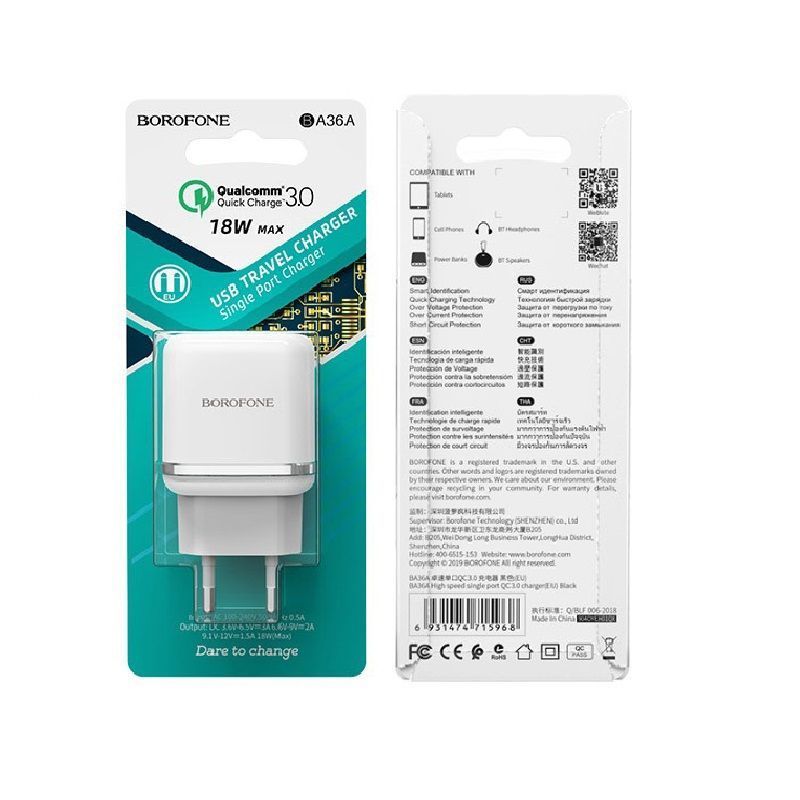 Borofone BA36A High Speed сетевое зарядное устройство, которое поддерживает многие актуальные стандарты быстрой зарядки: Quick Charge версии 3.0 и 2.0, Fast Charge и Super Fast Charge, Adaptive Fast Charging. Благодаря этому зарядка совместимых моделей смартфонов занимает меньше времени. А также эта модель оснащена многоуровневой системой защит, чтобы процесс зарядки был не только быстрым, но и безопасным.