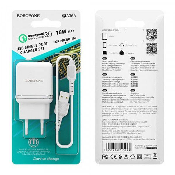 Читать все статьиСЗУ BOROFONE BA-36AQC3.0 18W +microUSB 2.1A White