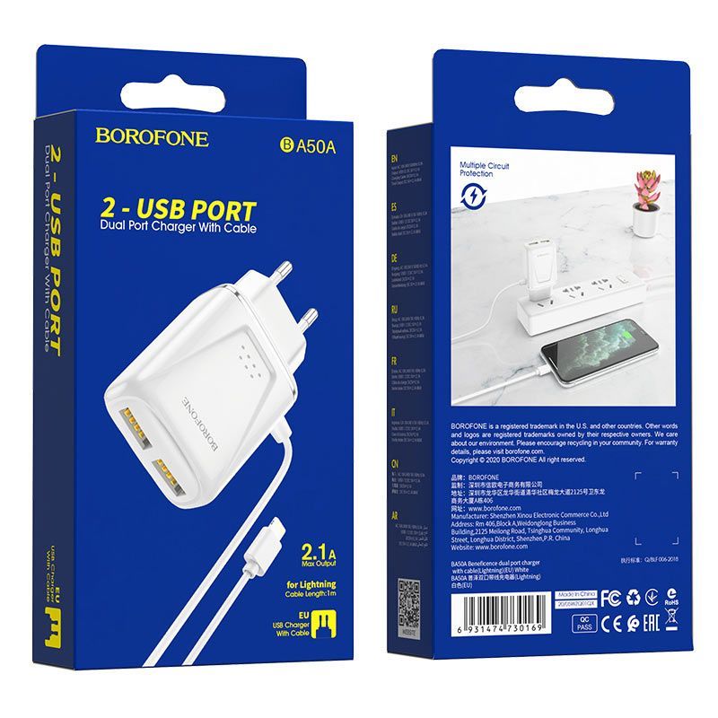 Читать все статьиСЗУ BOROFONE BA-50A 2*USB+Lightning 2.1A White