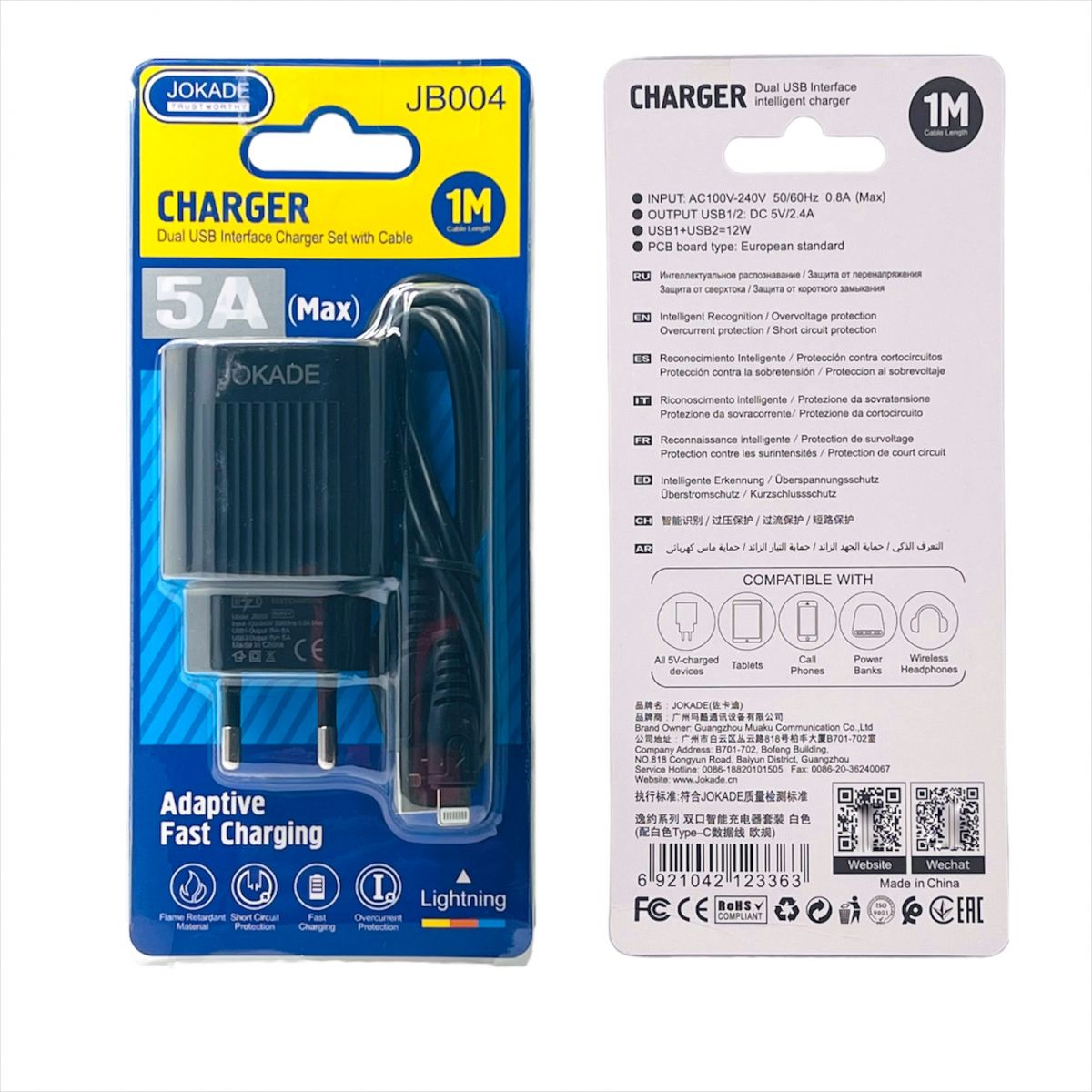 Читать все статьиСЗУ JOKADE JB004 2*USB + LIGHTNING 5A Black