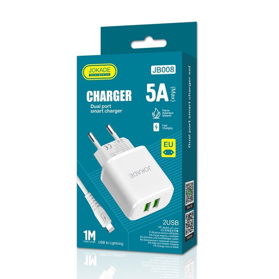 Читать все статьиСЗУ JOKADE JB008 2*USB +LIGHTNING 5A White